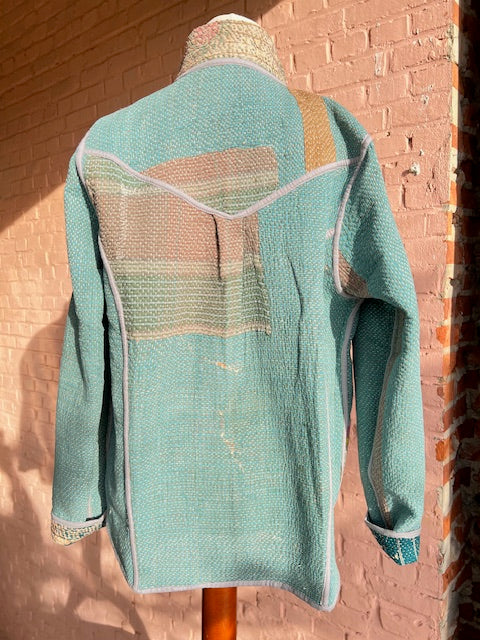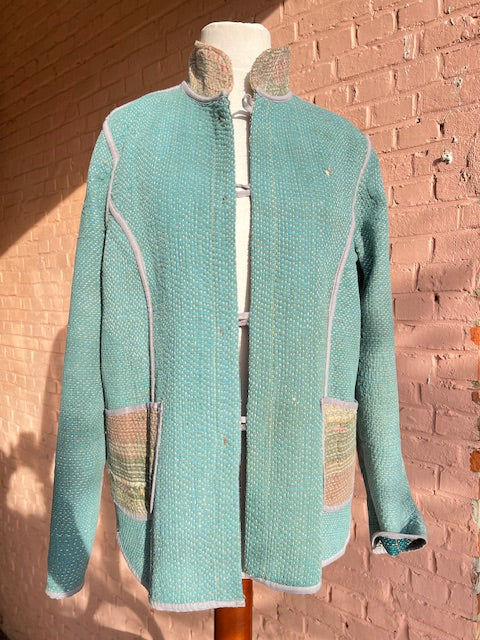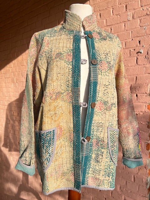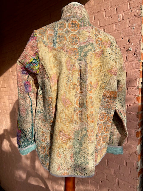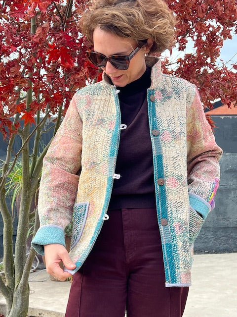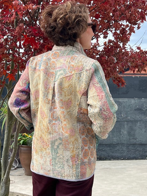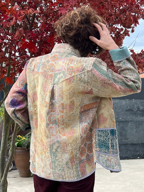 Elk Kantha vest vertelt een verhaal. Gemaakt van handgestikte, antieke (50-100 jaar oud) katoenen quilts en met zorg opnieuw samengesteld. Geen twee vesten zijn hetzelfde.