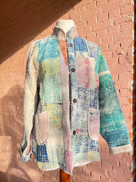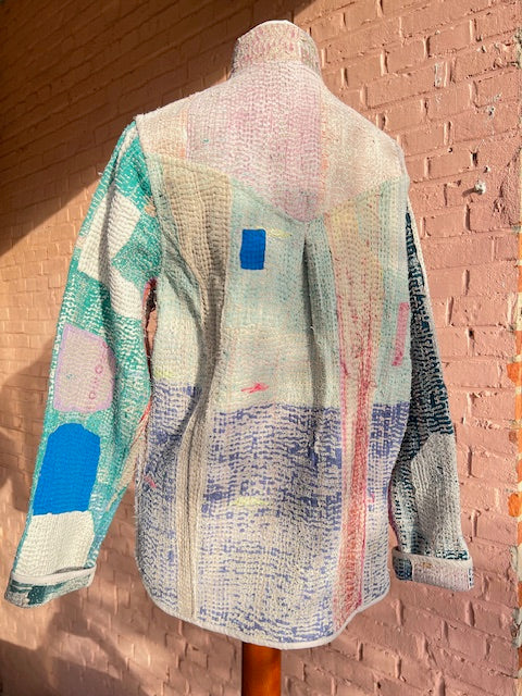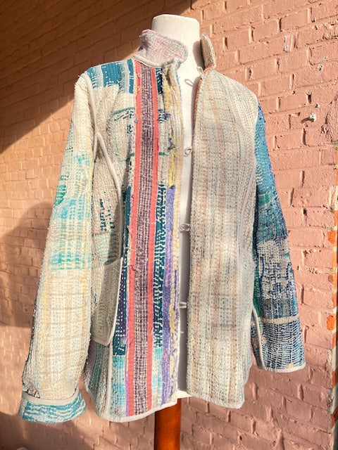 Elk Kantha vest vertelt een verhaal. Gemaakt van handgestikte, antieke (50-100 jaar oud) katoenen quilts en met zorg opnieuw samengesteld. Geen twee vesten zijn hetzelfde.