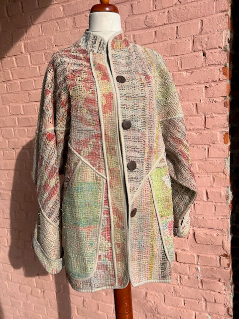 Elk Kantha vest vertelt een verhaal. Gemaakt van handgestikte, antieke (50-100 jaar oud) katoenen quilts en met zorg opnieuw samengesteld. Geen twee vesten zijn hetzelfde.