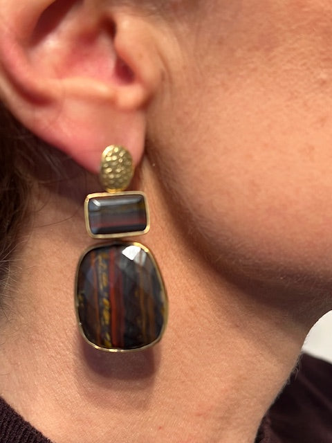 Gold-plated 92.5 Sterling silver earring with iron tiger gemstone.